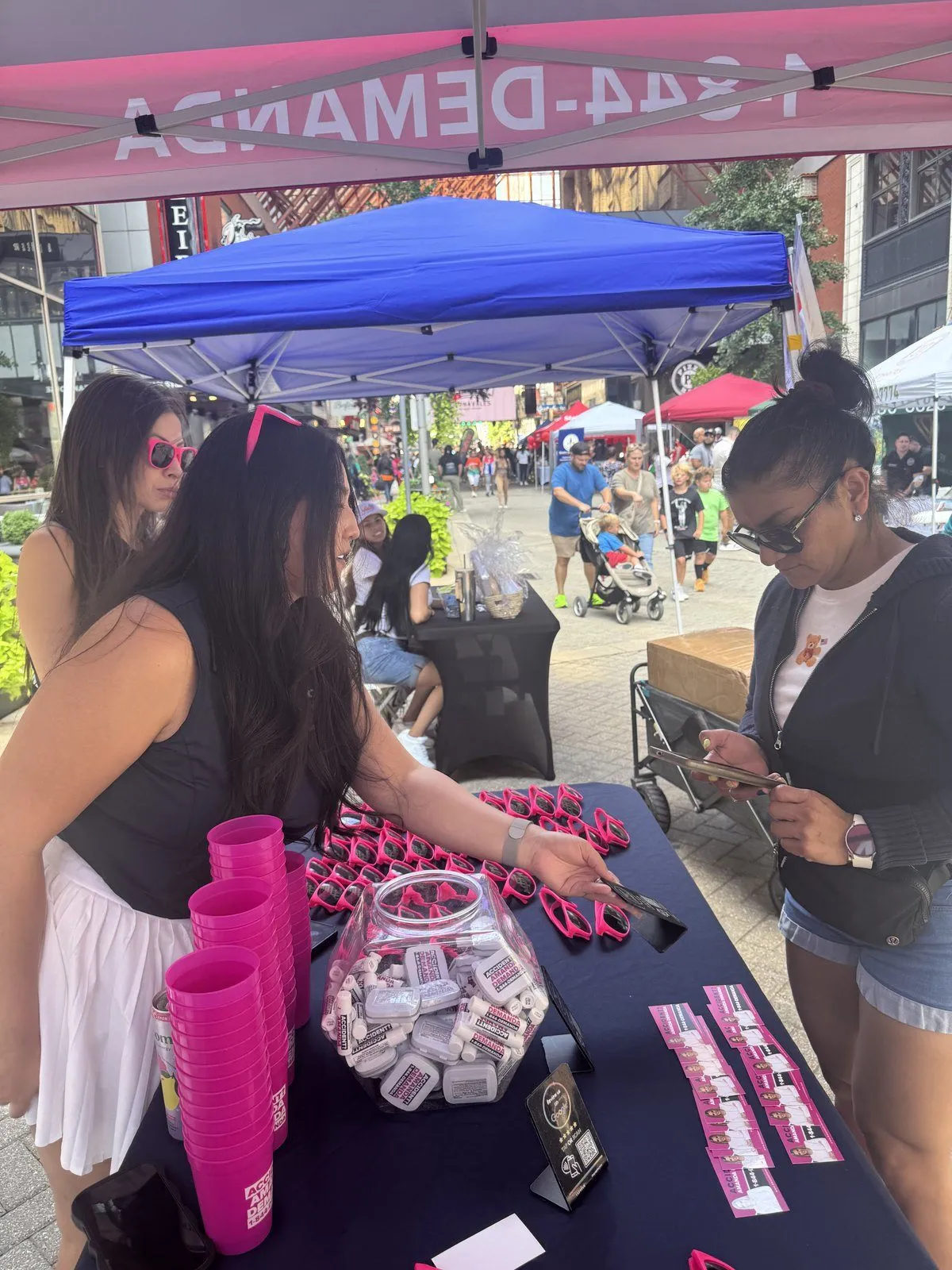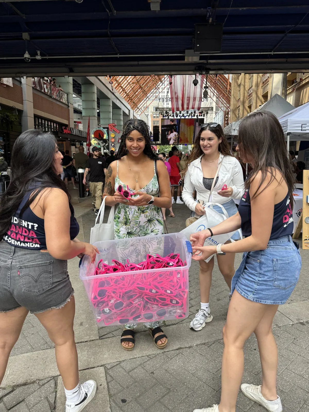 Nuestra merch fue un éxito total. Repartimos gafas rosadas, vasos, linternas y mucho más. Fue increíble ver a tantas personas usando nuestros productos por todo el lugar, ¡la familia Amanda Demanda estaba en todas partes!